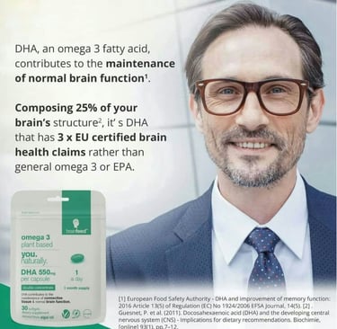 As you hit your fifties, inflammation is the quiet villain. It sneaks up, dulling your spark and speeding up the ageing clock. Omega-3 fatty acids are your body’s natural defenders, tackling inflammation, boosting brain health, and keeping your heart in top nick. But fish oil?- the fishy burps, questionable sustainability, and potential toxins in the mix are a hard no for me. Algae-based Omega-3, though? Clean, vegan, and straight from the source—phytoplankton, nature’s Omega-3 factory. Brain Feed’s capsules deliver 550mg DHA per capsule. No fillers. No aftertaste, no bloating, just results, but what is DHA?